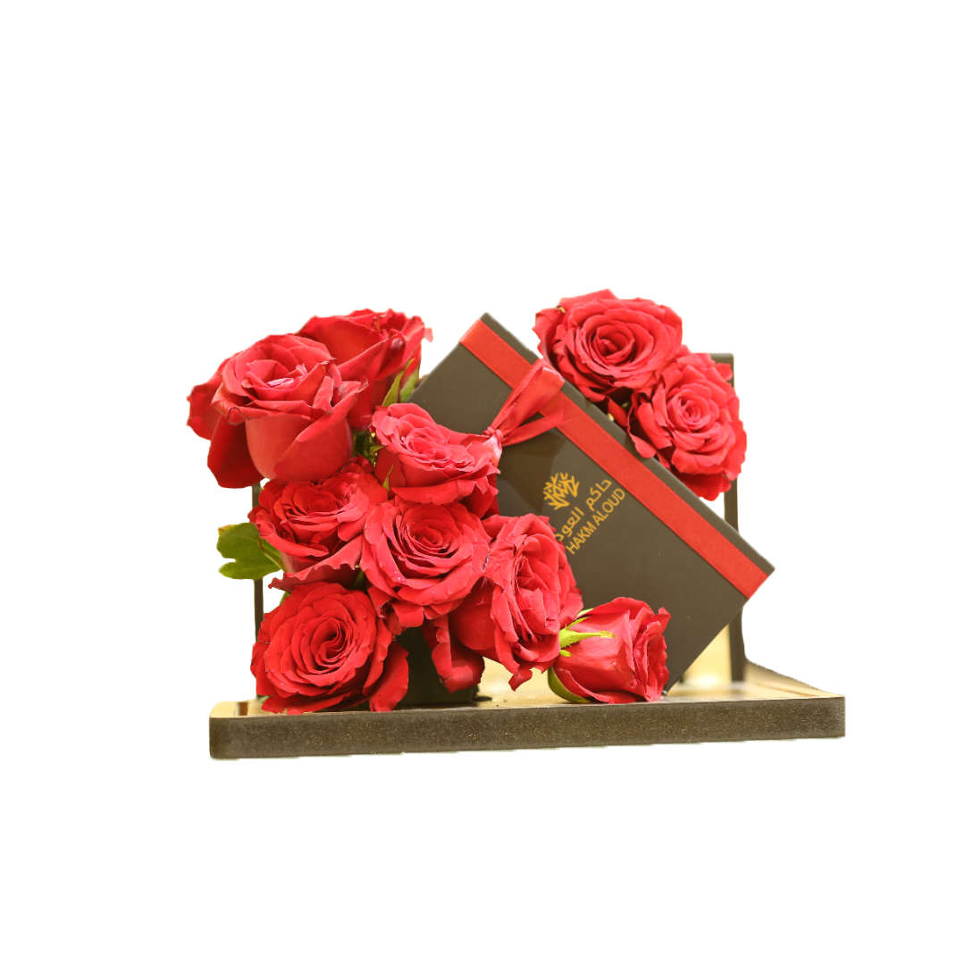 هدية قيمة عبارة عن صندوق فاخر فيه عدد من الورد مع عطر فاخر من حاكم العود